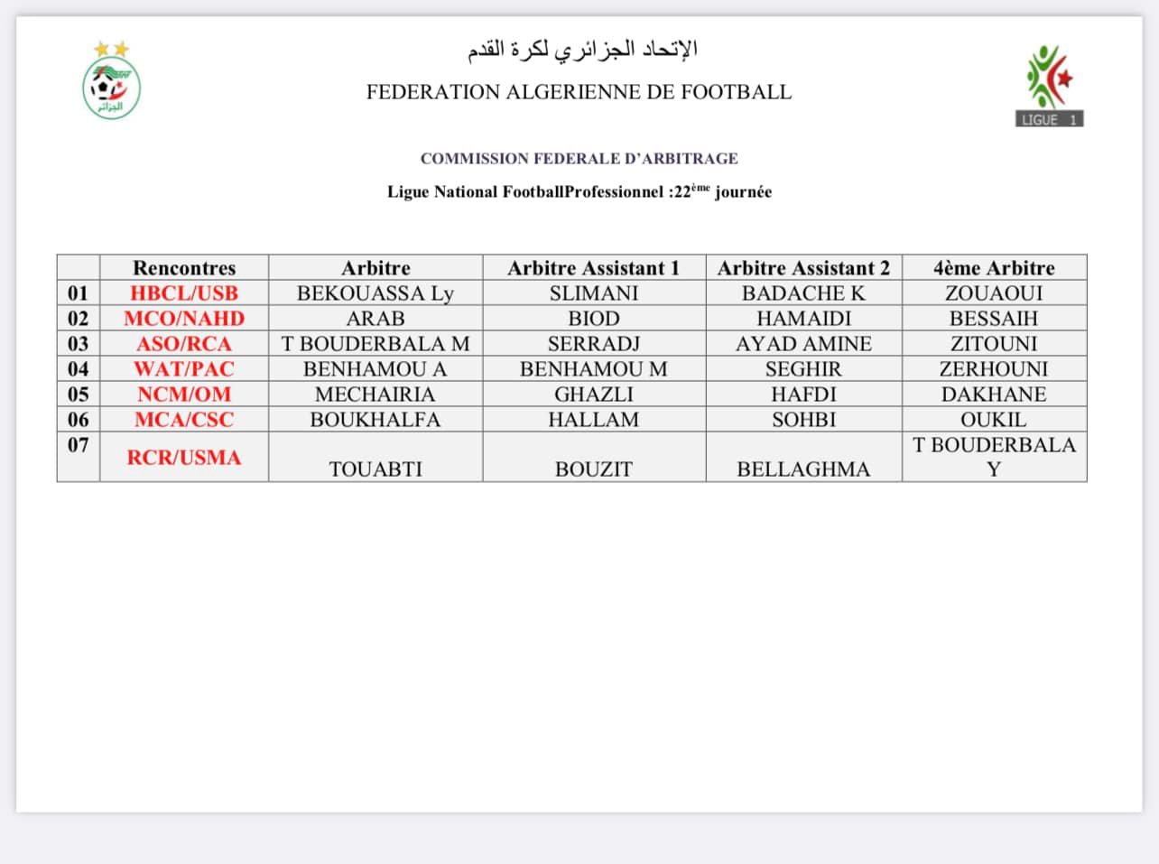 وسيدير الحكم اعراب مباراة مولودية وهران ونصر حسين داي.كما سيدير الحكم بودربالة لقاء جمعية الشلف وأمل الأربعاء.