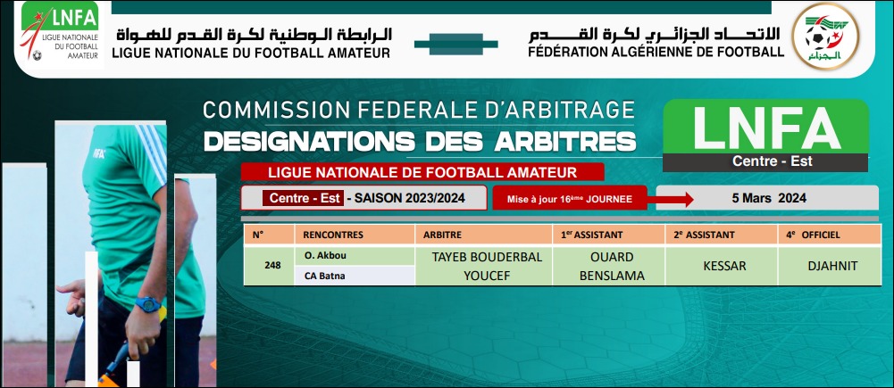 من جهة أخرى، أختير الحكم بودربال، لإدارة المبارة المتأخرة عن الدور الـ16، والتي ستجمع أولمبيك أقبو، شباب باتنة.