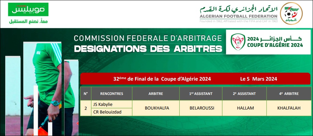 كشف الاتحاد الجزائري لكرة القدم، هوية الحكام المعنيين بإدارة المبارتين المتأخرتين عن الدور الـ32، والـ16 من منافسة كأس الجزائر.