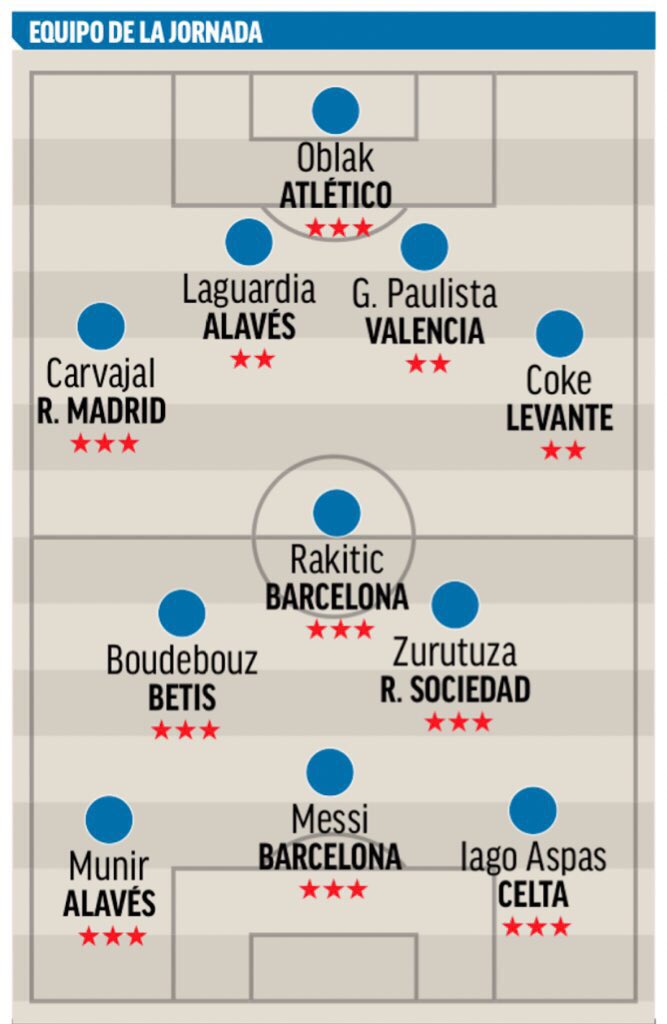 ويتواجد في التشكيلة المثالية لليغا في الجولة الماضية العديد من النجوم يتقدمهم “ليونيل ميسي”.