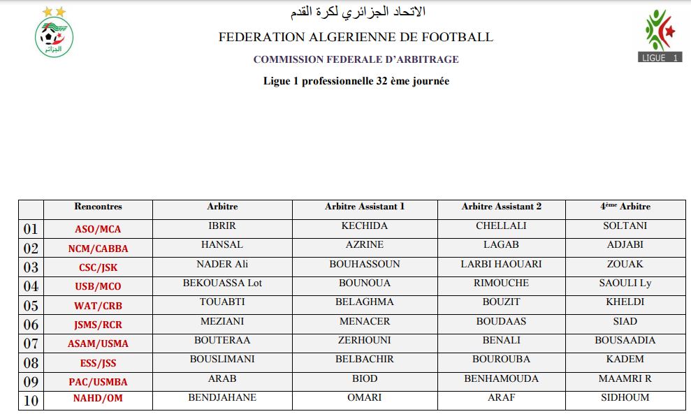 وسيدير الحكم بوسليماني، هذه المواجهة بمساعدة كل من بلبشير، مساعد أول، وبوروبا، مساعد ثاني، بالإضافة لكادم كحكم رابع.