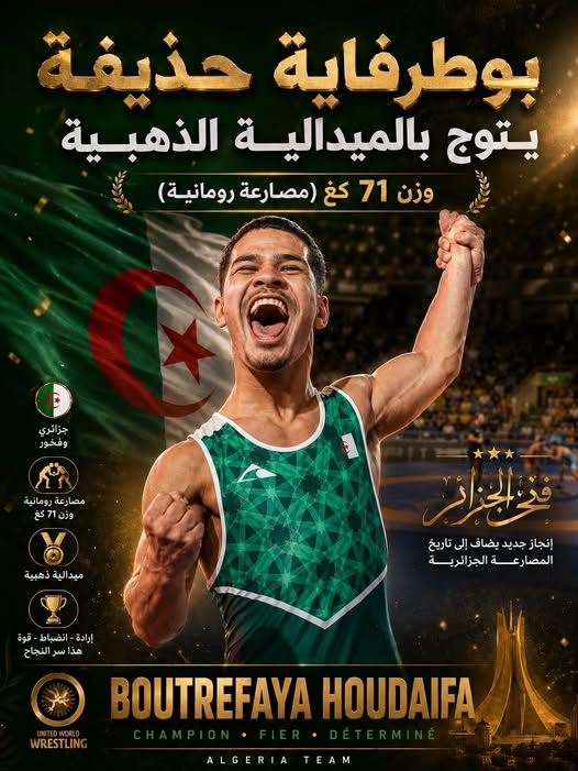 وتمكن حذيفة بوطرفاية، من اعتلاء منصة التتويج في وزن 71 كلغ، عقب مشوار مميز أظهر فيه قوة بدنية وانضباطا تكتيكيا عاليا، ليهدي الجزائر ميدالية ذهبية مستحقة.