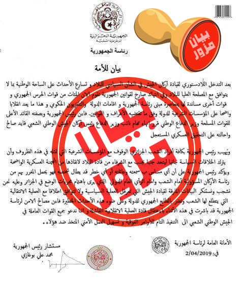 البيان حمل أخبار كاذبة تتعلق بالفريق أحمد قايد صالح قائد أركان الجيش نائب وزير الدفاع، وسرعان ما كذبته وزارة الدفاع.