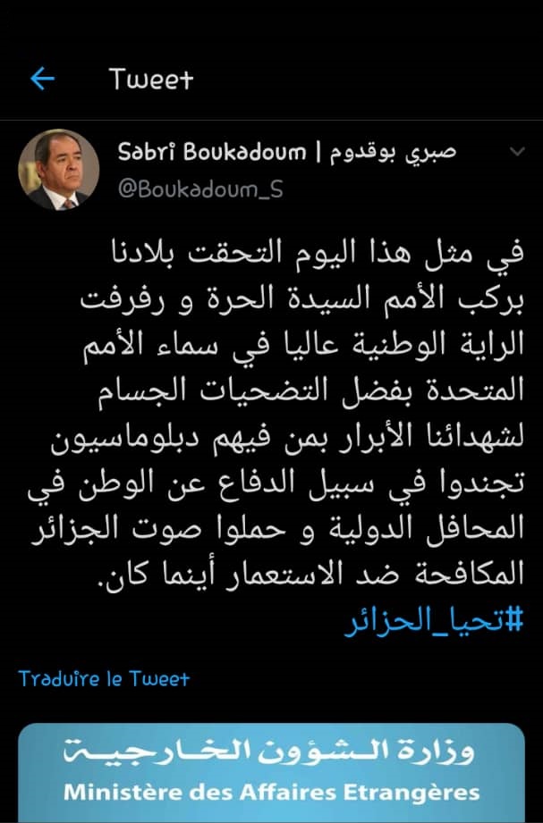 أستذكر وزير الخارجية صبري بوقادوم تضحيات الشعب الجزائري لنيل الحرية وذكرى إنضمام الجزائر لهئية الأمم المتحدة بتاريخ 8 أكتوبر 1962.
