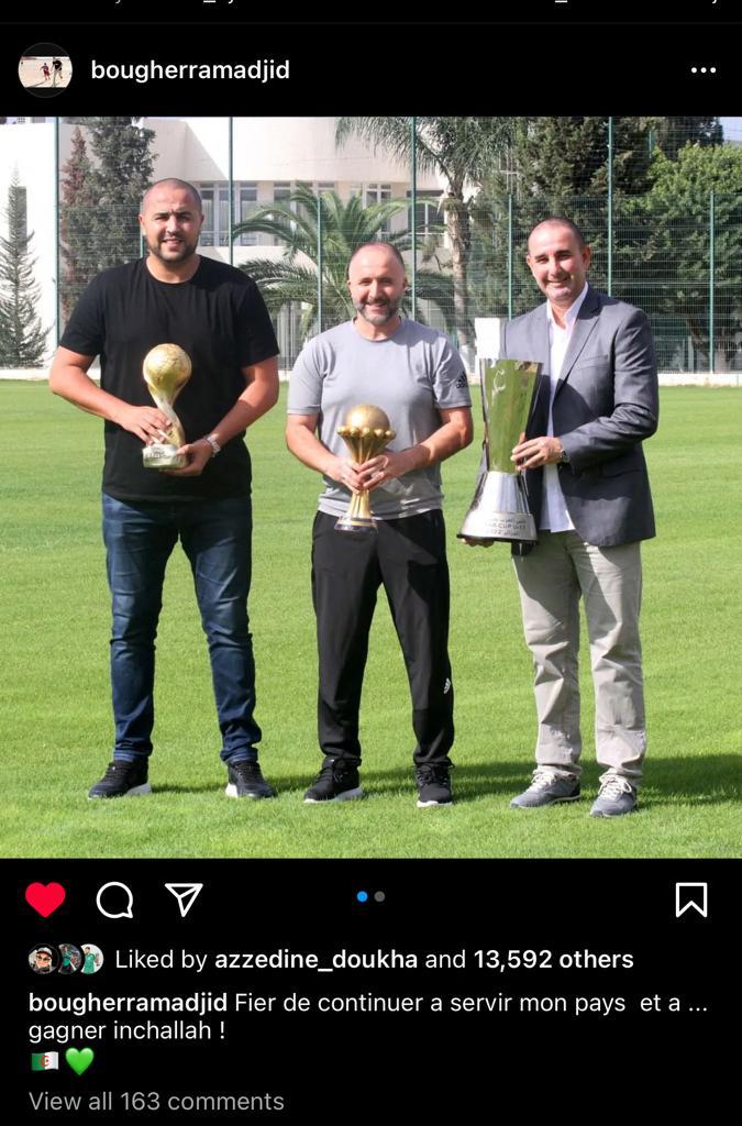 ونشر بوقرة، صورة له عبر حسابه الرسمي على انستغرام، تجمعه بالناخب الوطني جمال بلماضي، حاملان تتويجهما بكأس امم إفريقيا، وكأس العرب.