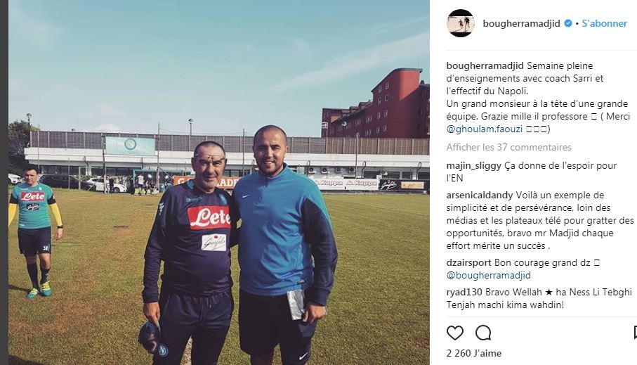 ونشر مدرب الرديف لفريق الدحيل القطري “مجيد بوقرة” صورة له رفقة مدرب فريق نابولي “ماوريتسيو ساري” خلال أحد الحصص التدريبية لفريق الجنوب الإيطالي.