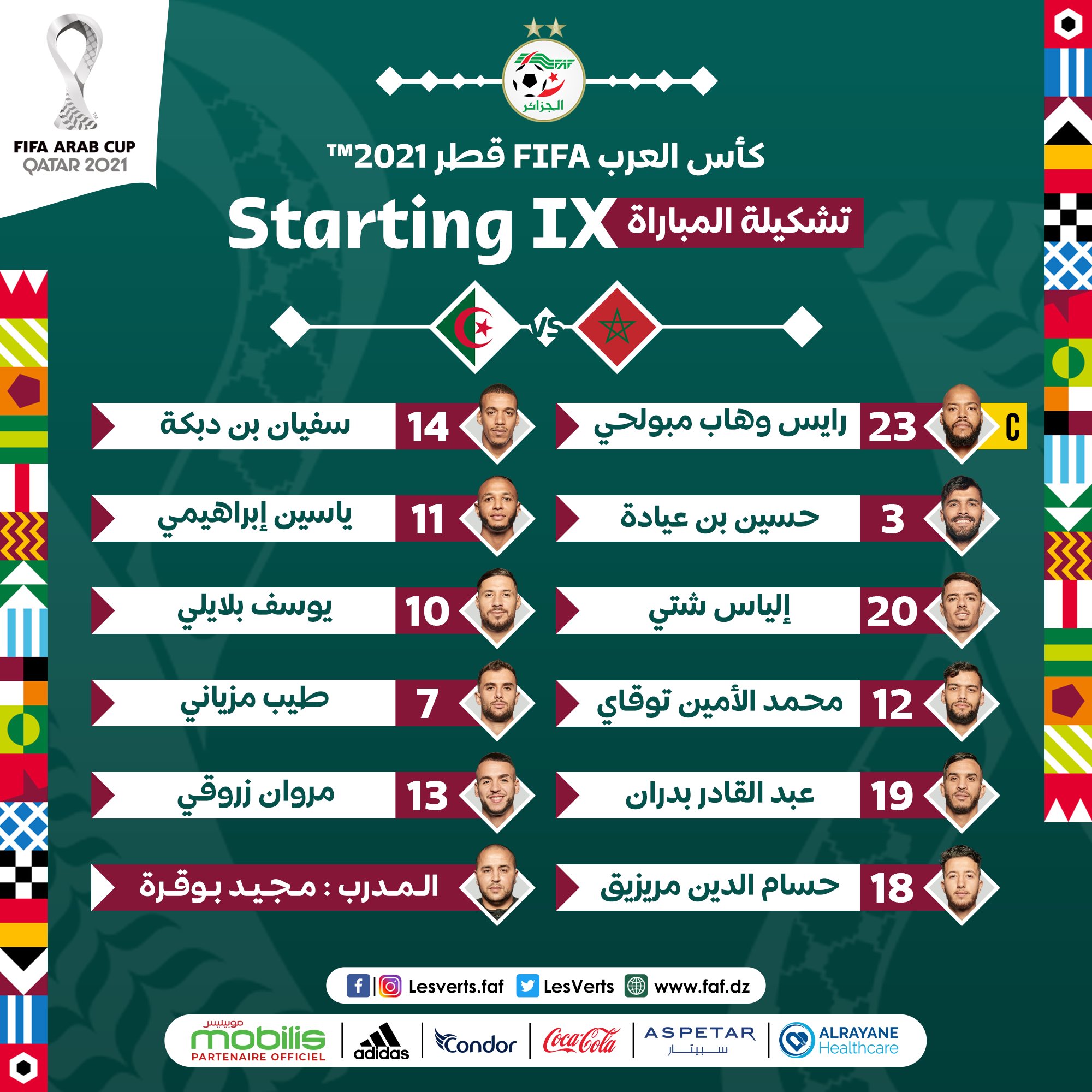 وجاءت التشكيلة الأساسية التي سيدخل بها بوقرة المباراة على النحو التالي: