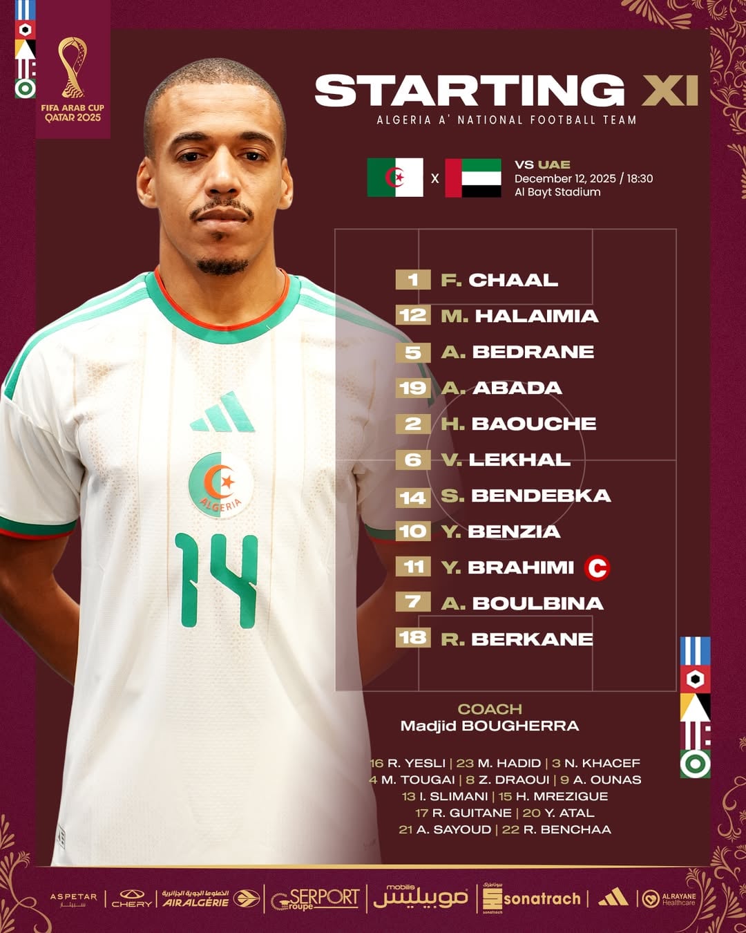 وجاءت تشكيلة الخضر” تحسبا لمواجهة الإمارات على النحو التالي: شعال، حلايمية، بدران،عبادة، بعوش، لكحل،بن دبكة، بن زية، براهيمي، بولبينة، بركان.
