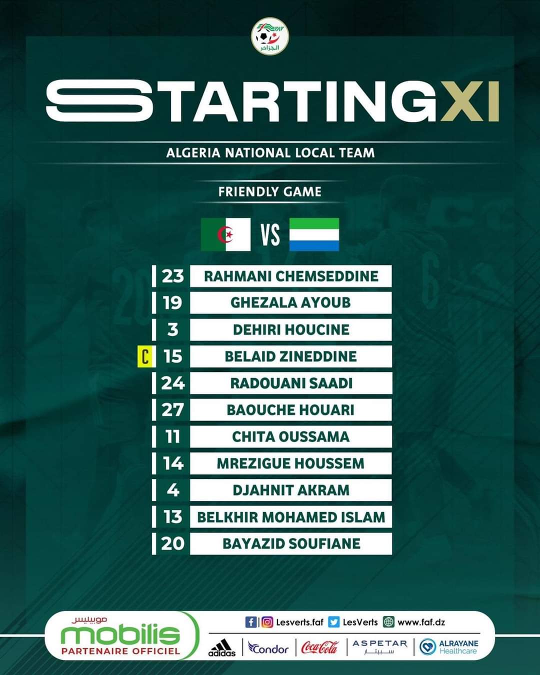 وكشف المدرب مجيد بوقرة، عن التشكيلة الأساسية التي سيعتمد عليها مع بداية هذه المواجهة أمام منتخب سيراليون.