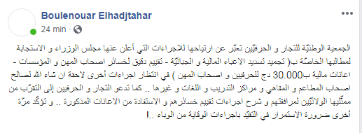 كما استحسنت الجمعية في منشور لرئيسها بولنوار حاج الطاهر الاستجابة لمطالبها الخاصّة بتجميد تسديد الاعباء المالية والجبائيّة وتقييم دقيق لخسائر اصحاب المهن و المؤسسات  اعانات مالية ب30.000 دج للحرفيين واصحاب المهن الصغيرة.