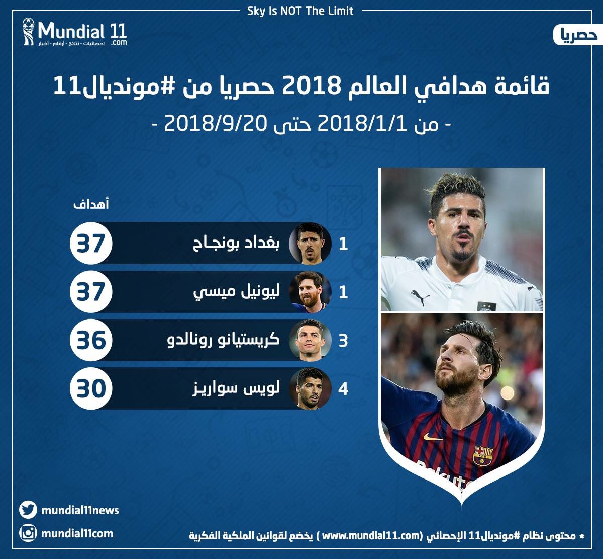 وكشف موقع “مونديال 11” العربي، أن بغداد بونجاح، احتل صدارة ترتيب هدافي العالم، للفترة ما بين 1 جانفي إلى 20 سبتمبر 2018 مناصفة مع ميسي، برصيد 37 هدفا.