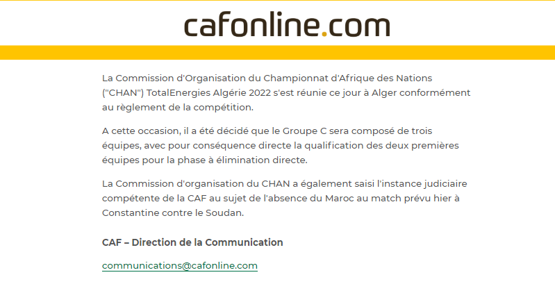 كشف الإتحاد الإفريقي لكرة القدم الكاف في بيان صادر عبر الموقع الرسمي أنه تلقى بيانا من قبل لجنة تنظيم الشان. حول غياب المغرب.