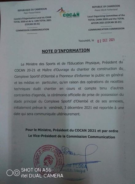 كما أعلن الإتحاد الكاميروني، أنّه سيعلن عن موعد الإفتتاح في موعد لاحق، دون تحديده.