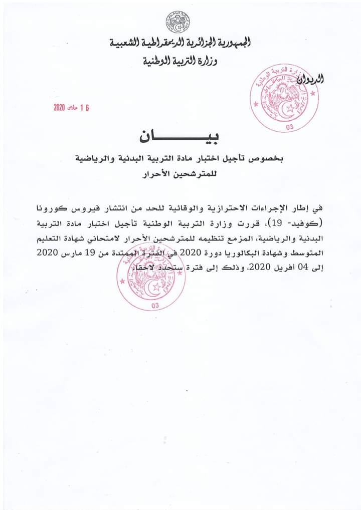 والتي كانت مقررة بين 19 مارس و4 أفريل وسيتم في وقت لاحق تحديد موعد جديد للاختبارات يضيف ذات البيان.