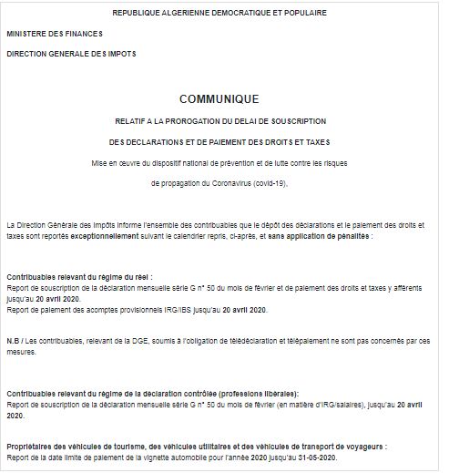 وأكدت المديرية أنه وبالنسبة للمكلفين بالضريبة التبعين لنظام الربح الحقيقي، تم تأجيل الإكتتاب التصريح الشهري سلسلة ج 50، لشهر فيفري، وكذا ودفع الرسوم والضرائب المتعلقة به حتى تاريخ الـ 20 أفريل 2020.