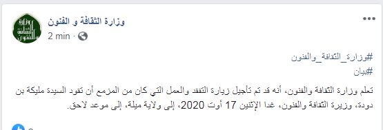 أعلنت وزارة الثقافة والفنون عن تأجيل زيارة وزيرة الثقافة الى ولاية ميلة.