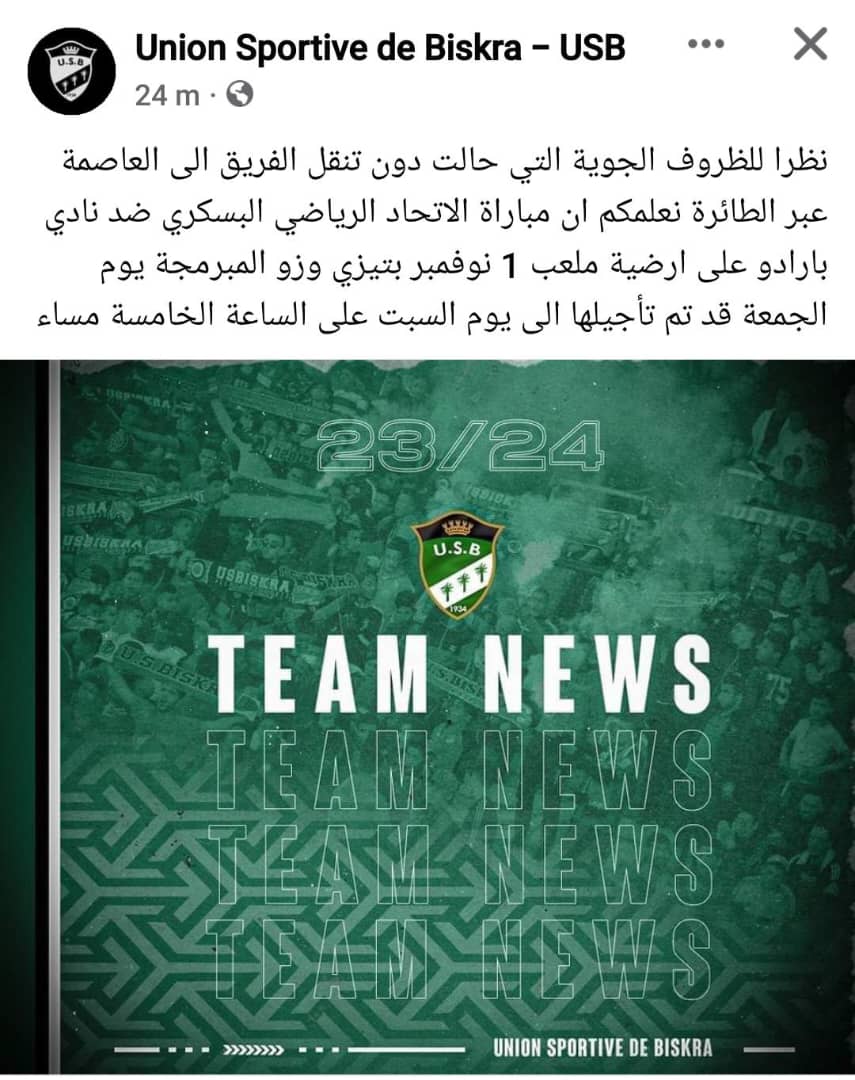 كشفت إدارة فريق إتحاد بسكرة عن تأجيل المباراة القادمة أمام نادي بارادو على أرضية ميدان 1 نوفمبر بتيزي وزو إلى السبت القادم.
