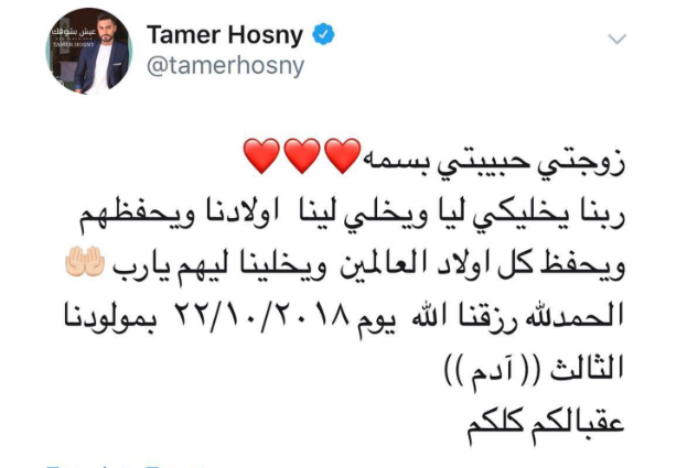 هذا وأطلق تامر حسني اسم “آدم” على مولوده الثالث معبرا عن سعادته في التغريدة.