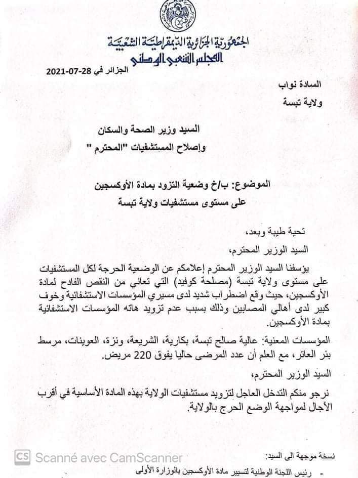 المحتجون عبروا عن عميق أسفهم وألمهم للوضعية الكارثية الناتجة عن نقص التكفل الطبي بفعل تذبذب عملية التزود بمادة الأكسجين ومشاكل أخرى تعصف بذويهم مقابل عدم وجود ردة فعل ايجابية وسريعة، كما كتب عبر عدد من هذه الشعارات مطالب لممثلي السلطات العليا في البلاد تناشدهم بضرورة إنهاء مهام مدير الصحة والسكان الذي عجز حسبهم عن تسيير أزمة كورونا وفشله أيضا في النهوض بالقطاع من جميع جوانبه، وهو ما ذهب اليه نواب الولاية السبعة وممثلي سكانها على مستوى المجلس الشعبي الوطني من خلال عريضة مستعجلة تم توقيعها جماعيا وأرسلت الى وزير الصحة والسكان، عبد الرحمن بن بوزيد، ومعه رئيس اللجنة الوطنية لتسيير مادة الأكسجين بالوزارة الأولى، محتواها معنون ويتحدث عن وضعية التزود بمادة الأكسجين على مستوى جميع المستشفيات المتواجدة عبر الولاية الحدودية، حيث أكدوا للمسؤول الأول على قطاع الصحة في الجزائر، أن كل مصالح كوفيد التي تتوفر عليها تبسة، تعاني من النقص الفادح لهذه المادة الحيوية، مشيرين الى أنه وقع اضطراب شديد لدى مسيري هذه المؤسسات الاستشفائية، وخوف كبير لدى أهالي المصابين بسبب عدم تزويد هذه المصالح بمادة الأكسجين، مطالبينه بالتدخل العاجل لتزويد مستشفيات الولاية بهذه المادة الأساسية في أقرب الاجال لمواجهة الوضع الحرج، دون أن ينسوا بأن المستشفيات الان يتواجد بها أكثر من 220 مصاب يتلقون العلاج.