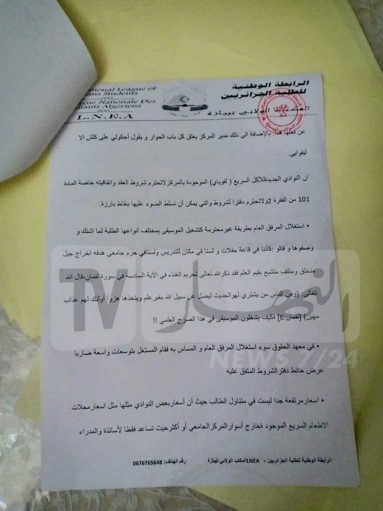 التي حولت هذا المرفق العلمي إلى ملهى ليلي في وضح النهار دون حسيب أو رقيب، والأدهى من هذا يقول بيان الطلبة تحصلت “النهار” على نسخة منه أن مدير الجامعة ضرب عرض بكل الشكاوي المتعلقة بهاته التجاوزات التي يمارسها الأشخاص الذين إستأجروا هاته النوادي لبيع المأكولات والمشروبات للطلبة.