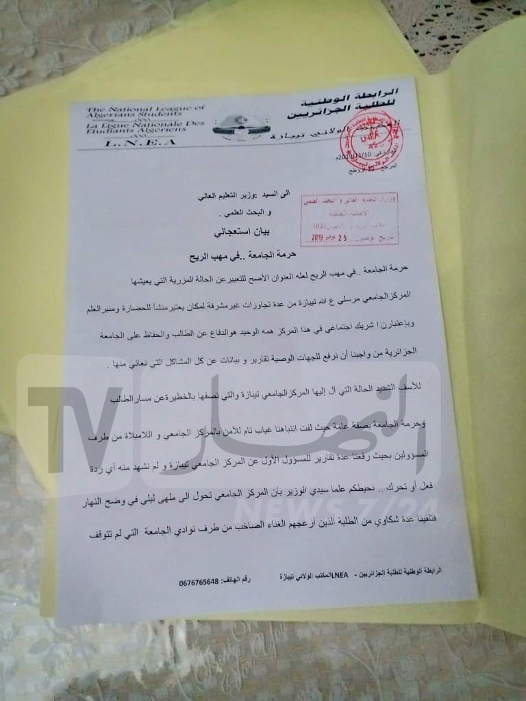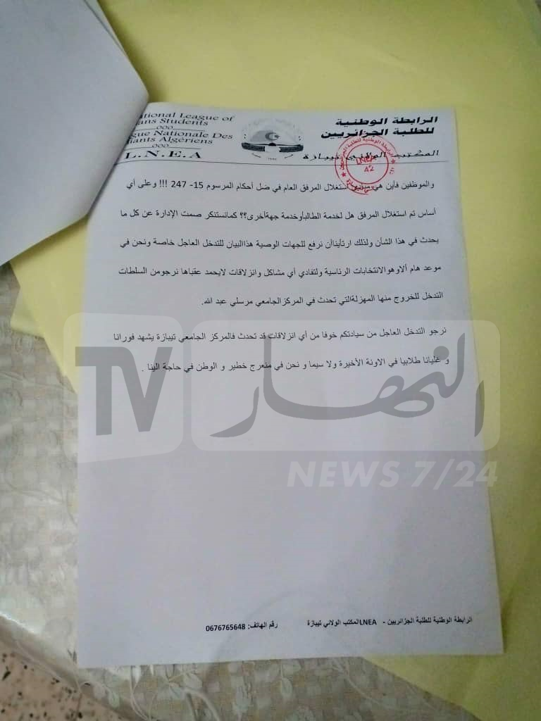 البيان الذي حمل عنوان إستنفاري مفاده، أن حرمة جامعة تيبازة في مهب الريح تحدث عن العديد من التجاوزات ومنها غياب الأمن وتجاوزات خطيرة تسببت فيها النوادي التي أزعجت الطلبة بسب الغناء الصاخب الذي لا يتوقف طيلة النهار.