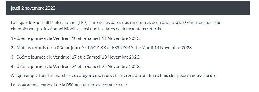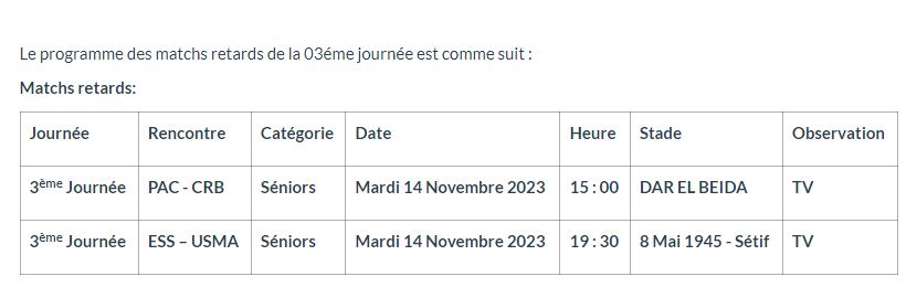كما برمجت الهيئة الكروية، اللقاءين المتأخرين عن الجولة الـ 3. بين كل من شباب بلوزداد أمام أتليتيك بارادو، ووفاق سطيف أمام اتحاد العاصمة، يوم الثلاثاء الـ 14 نوفمبر الجاري.