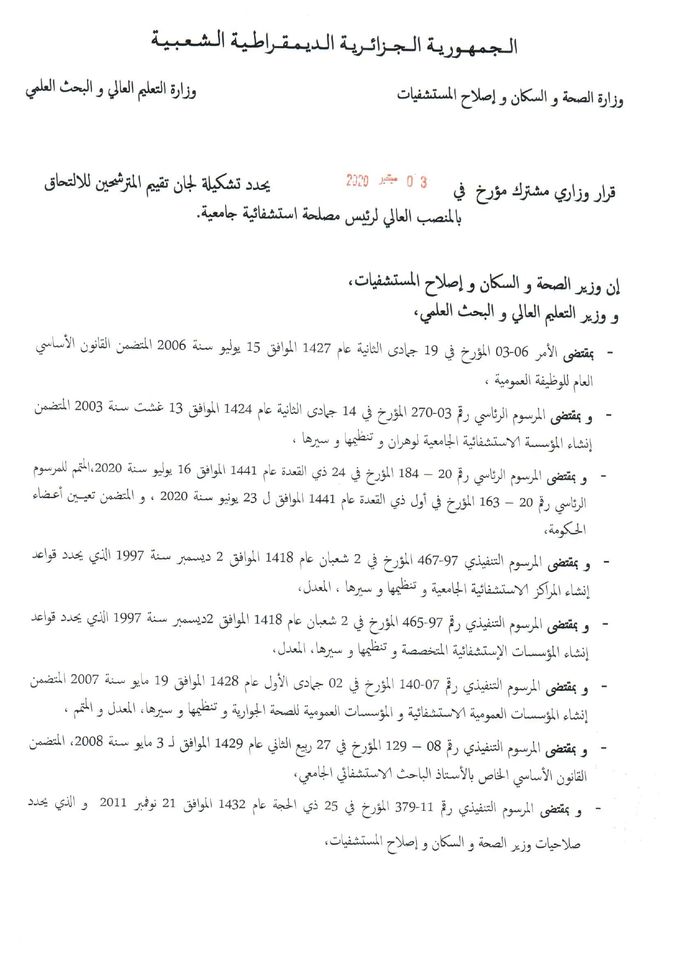 القرارا الوزاري صدر عن وزارة التعليم العالي والبحث العلمي، ووزارة الصحة والسكان واصلاح المستشفيات، والمؤرخ في 03 سبتمبر سنة 2020.