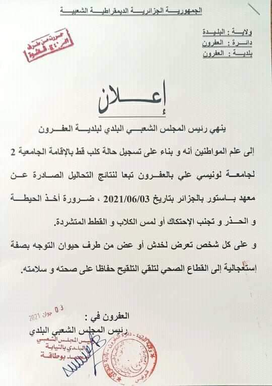 وذلك بعد ظهور نتائج التحليل الصادرة عن معهد باستور بالجزائر بتاريخ 2021/06/03 والتي أكدت تسجيل حالة كلب قط بالإقامة الجامعة 2.