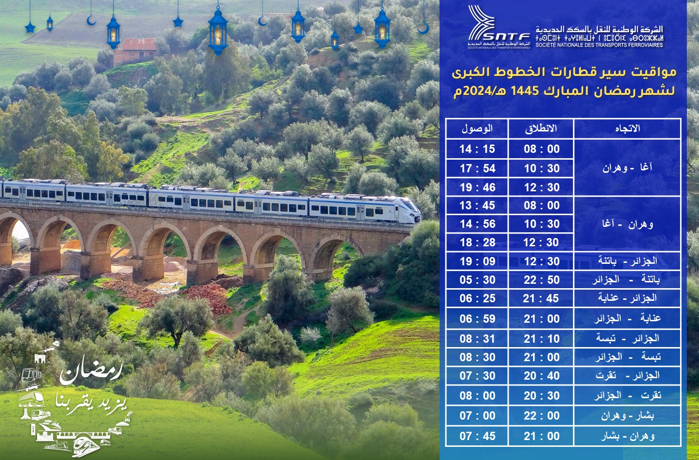 أعلنت الشركة الوطنية للنقل بالسكك الحديدية، اليوم الأحد، أن تحسبا لشهر رمضان المبارك تم تعديل برنامج سير قطارات الخطوط الكبرى.