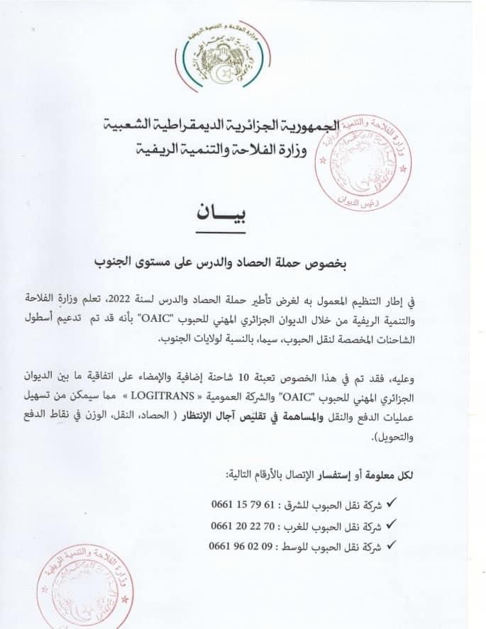 أصدرت وزارة الفلاحة والتنمية الريفية، بيانا، بخصوص حملة الحصاد والدرس على مستوى الجنوب وذلك في إطار التنظيم المعمول به لغرض تأطير حملة الحصاد والدرس لسنة 2022.