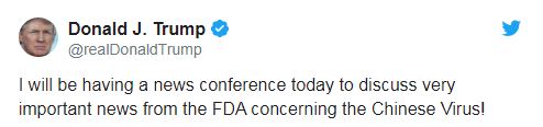 وكتب ترامب في تغريدة له “سأعقد مؤتمرا صحافيا اليوم لمناقشة نبأ مهم جدا من الإدارة الفدرالية للأدوية بشأن الفيروس الصيني”.