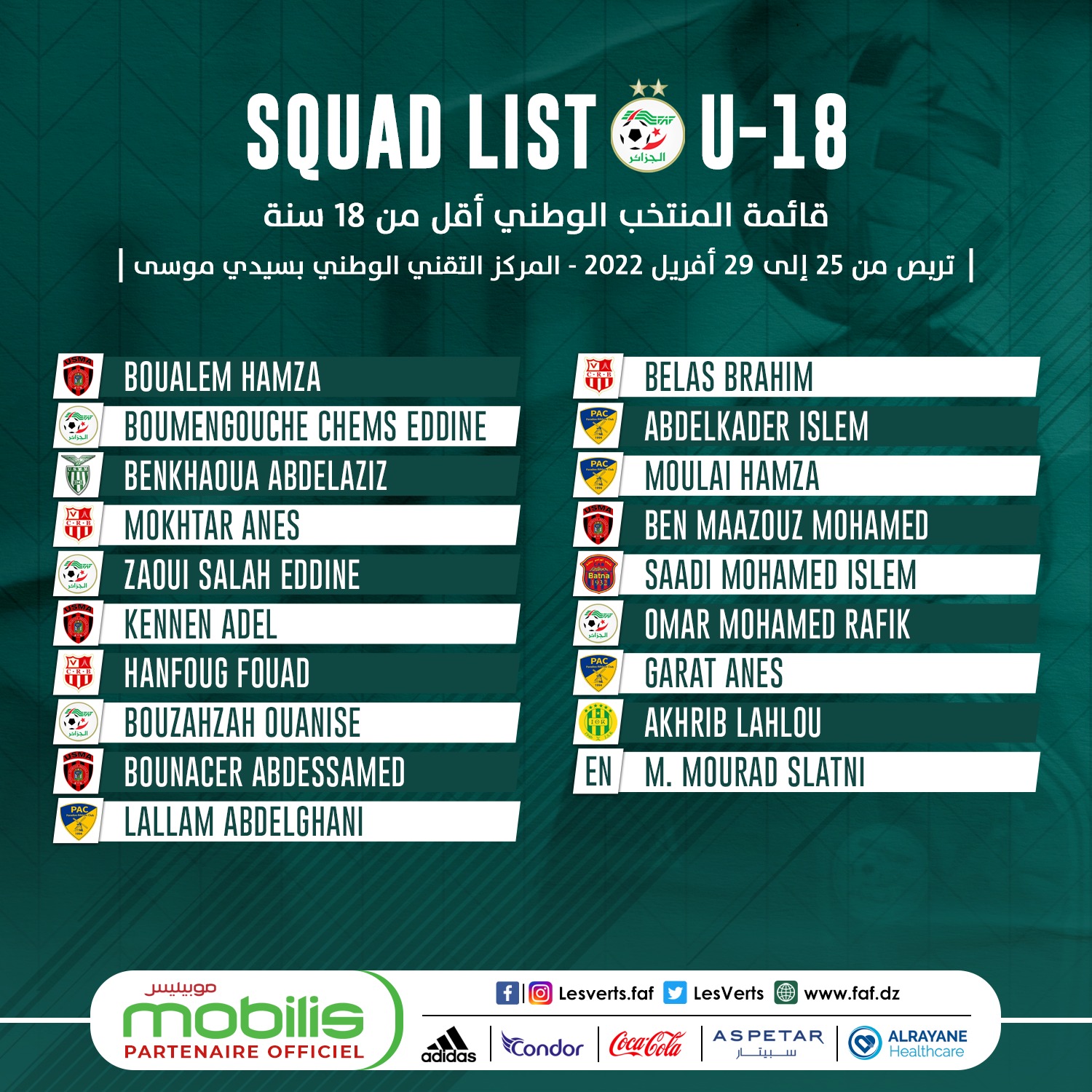 قرر الناخب الوطني، مراد سلاطني، استدعاء 18 لاعبا لتربص المُنتخب الوطني لأقل من 18 سنة.