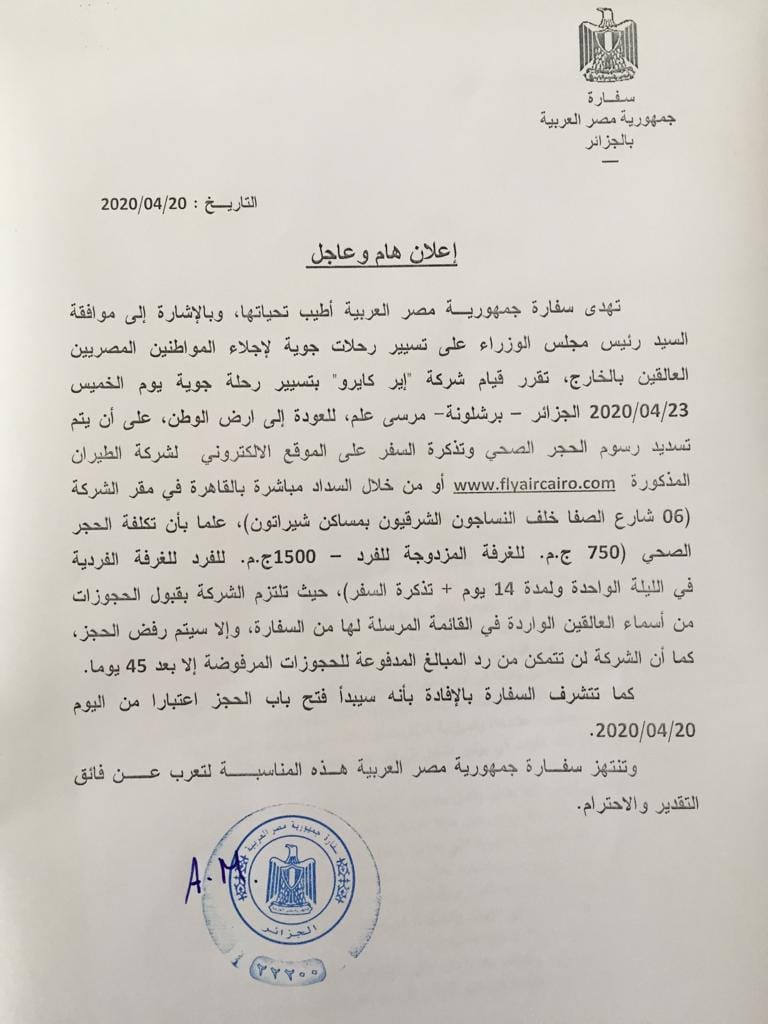 وأفاد بيان سفارة مصر لدى الجزائر، اليوم الاثنين، أنه سيتم تسديد رسوم الحجر الصحي، وتذكرة السفر على الموقع الالكتروني لشركة الطيران اير كايرو، أو من خلال السداد مباشرة بالقاهرة في مقر الشركة.