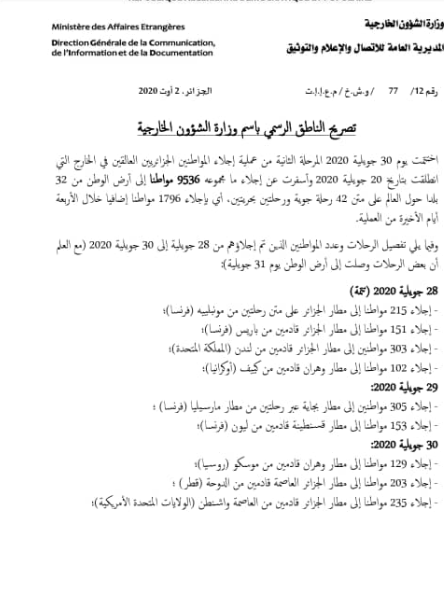 قال الناطق الرسمي باسم وزارة الشؤون الخارجية، أن المرحلة الثانية من عملية الاجلاء المواطنين الجزائريين في الخارج، اختتمت يوم 30 جويلية.