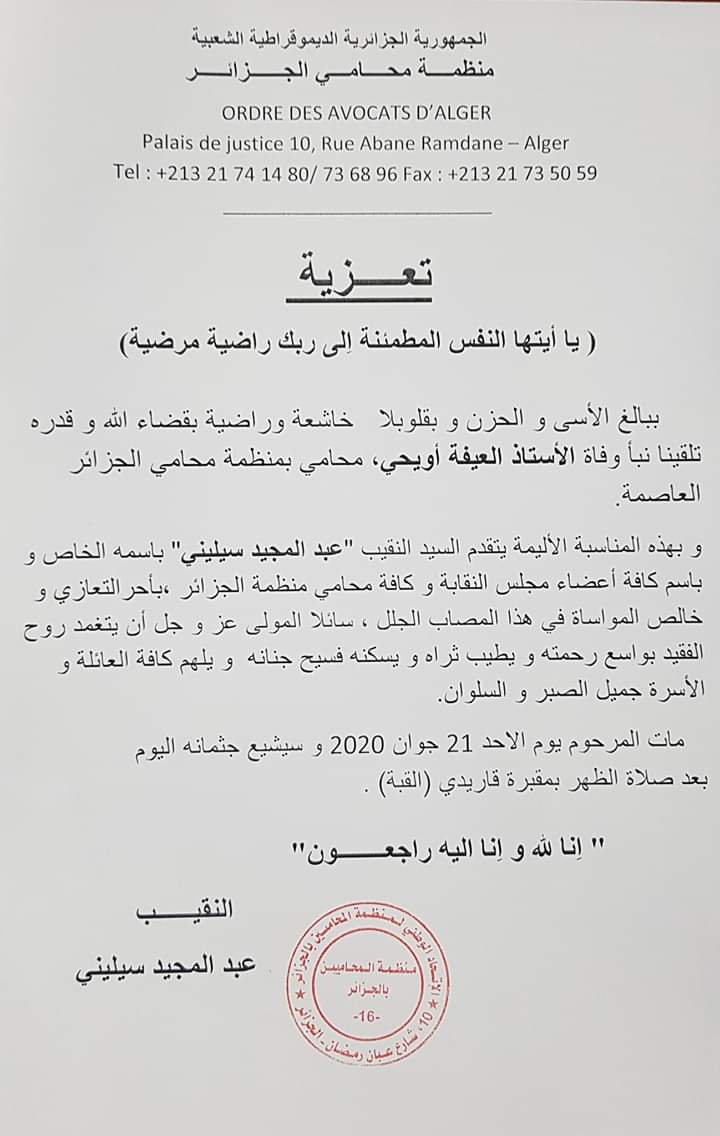 هذا وقدمت منظمة محامي الجزائر تعازيها الخالصة لعائلة المرحوم.