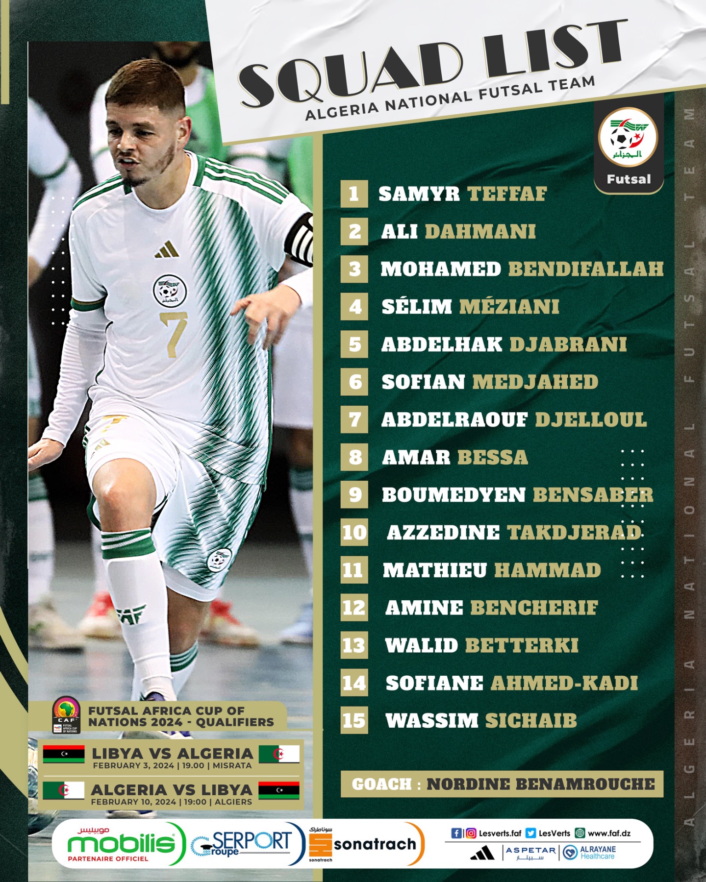 وحسب بيان الفاف عبر موقعها الرسمي، فإنه من المنتظر أن يغادر الخضر للفوتسال، غدا الأربعاء، إلى مدينة مصراتة.