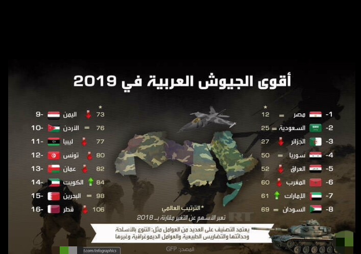 فيما احتل الجيش المغربي المرتبة السادسة، والجيش التونسي المرتبة الثانية عشر .