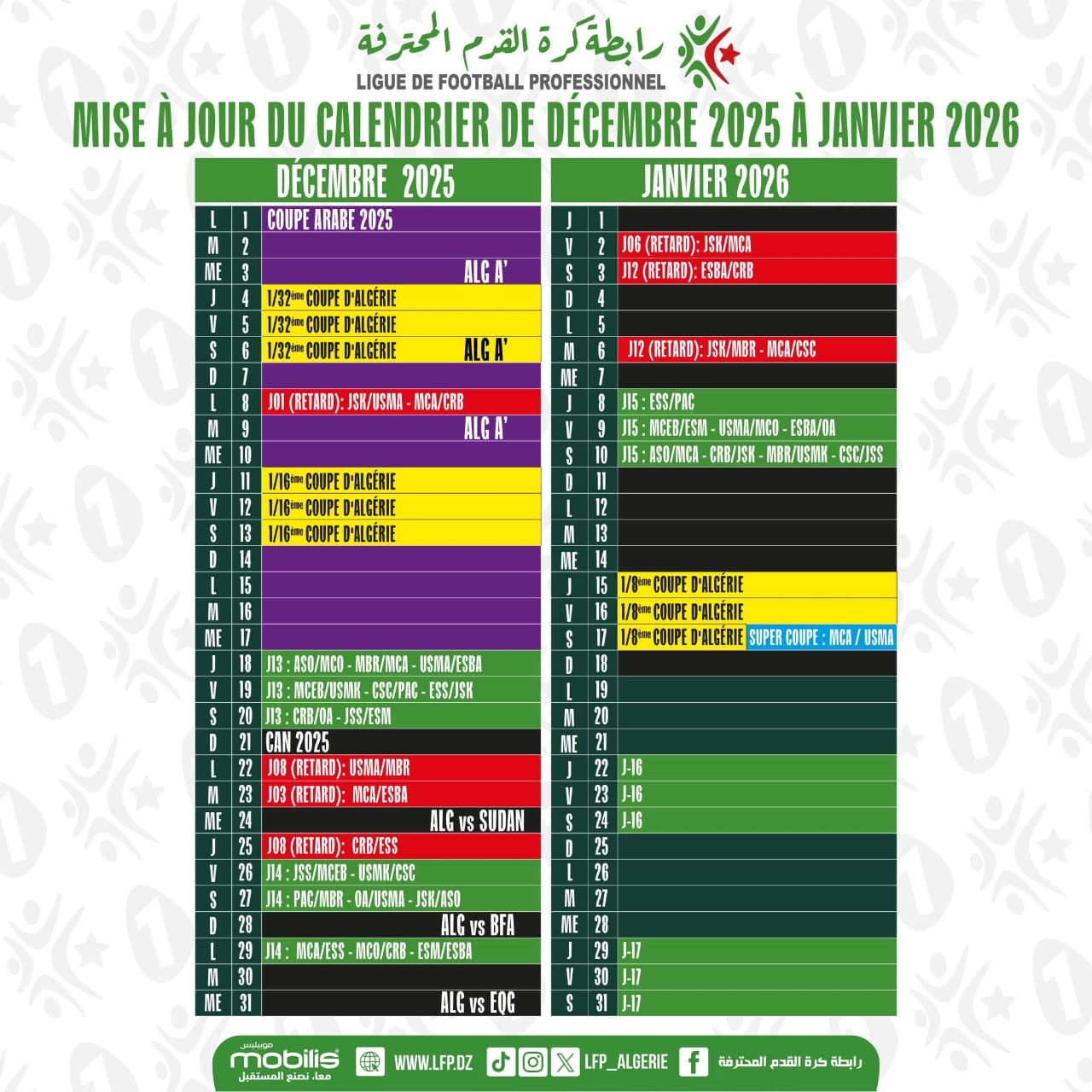 وتشمل هذه التعديلات الجولات الممتدة من الجولة 13 إلى الجولة 17، والمقرر إجراؤها خلال شهري ديسمبر وجانفي المقبلين.