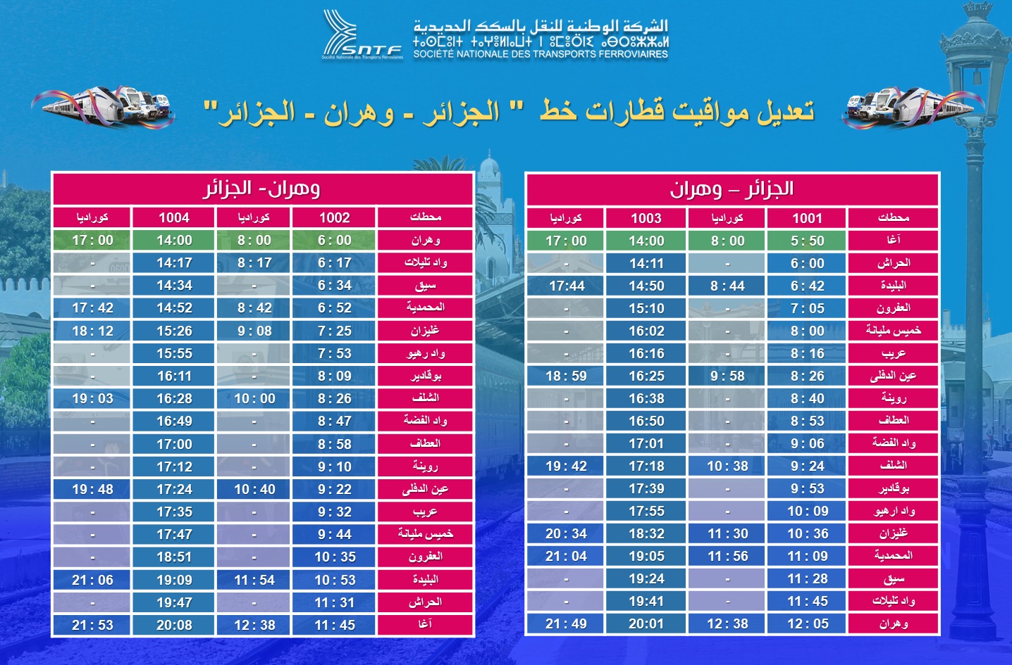 وتم تعديل برنامج سير القطارات على خط الجزائر – وهران – الجزائر، وفق البرنامج المبين أدناه.