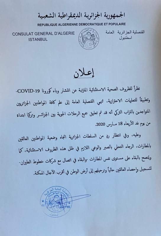 من جهتها دعت القنصلية الجزائرية العامة باسطنبول جميع المواطنين العالقين بالمطارات للصبر في انتظار رد السلطات الجزائرية اتجاه وضعيتهم ، والتحلي بالصبر والوعي اللازم في ظل هذه الظروف الاستثنائية.