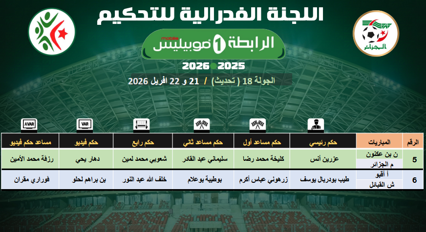 أعلنت لجنة التحكيم الفيدرالية التابعة للاتحاد الجزائري لكرة القدم، اليوم السبت، عن تعيينات الحكام الخاصة بمباريات تسوية الجولة الـ18 من الرابطة المحترفة، والتي ستُجرى يومي 21 و22 أفريل 2026.