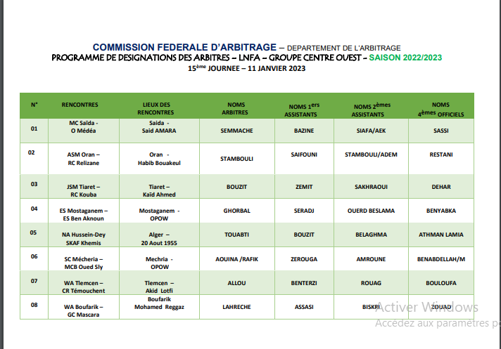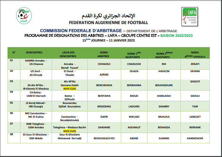 عيّنت لجنة التحكيم التابعة للاتحادية الجزائرية لكرة القدم “الفاف” حكام مباريات الجولة الخامسة عشر من مباريات بطولة الهواة.