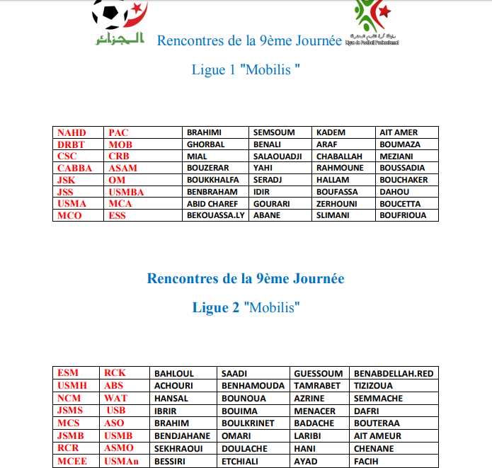 كشفت اللجنة الفيدرالية للتحكيم، التابعة للفاف، عن حكام الجولة التاسعة للمحترف الأول، يتقدمهم الحكم عبيد شارف، المكلف بإدارة الداربي العاصمي.