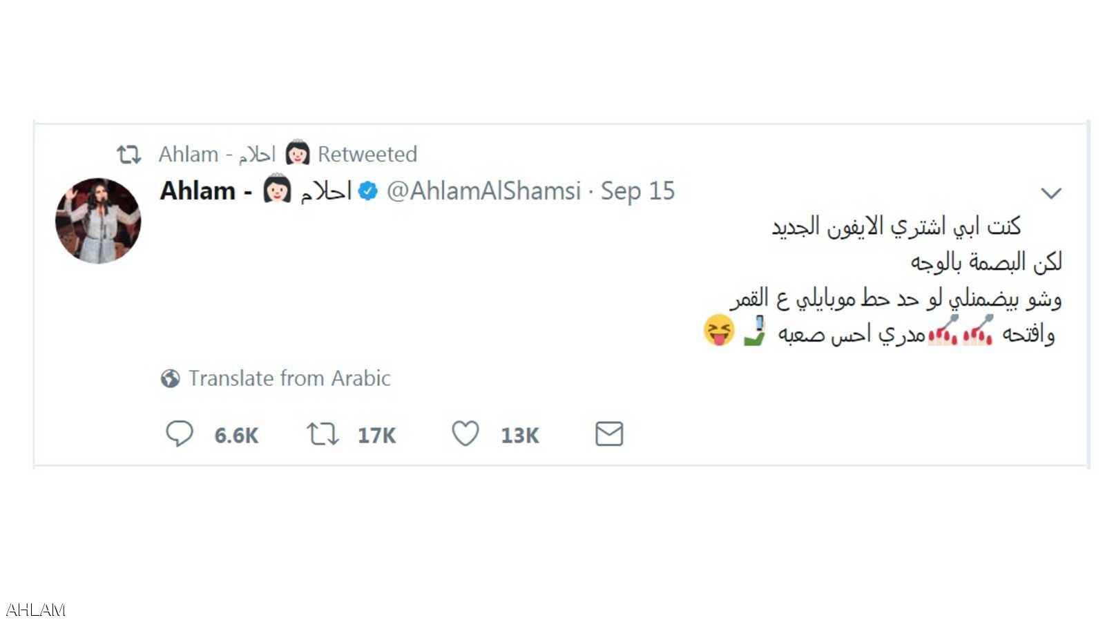 قالت أحلام مازحة، إنها لن تشتري “الآيفون” الجديد لأنها لا تضمن أن يفك أحد قفله باستخدام صورة القمر.