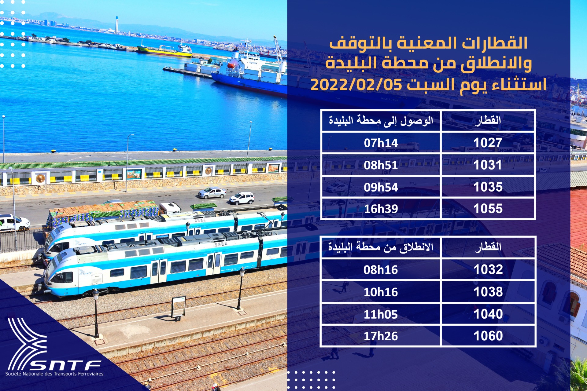 كما أوضحت، شركة السكك الحديدية، أن بعض القطارات ستتوقف، استثناء في هذا اليوم عند محطة البليدة ذهابا وإيابا. أما باقي الرحلات على خط الجزائر العفرون وكذا الخطوط الطويلة، ستسير حسب البرنامج العادي.