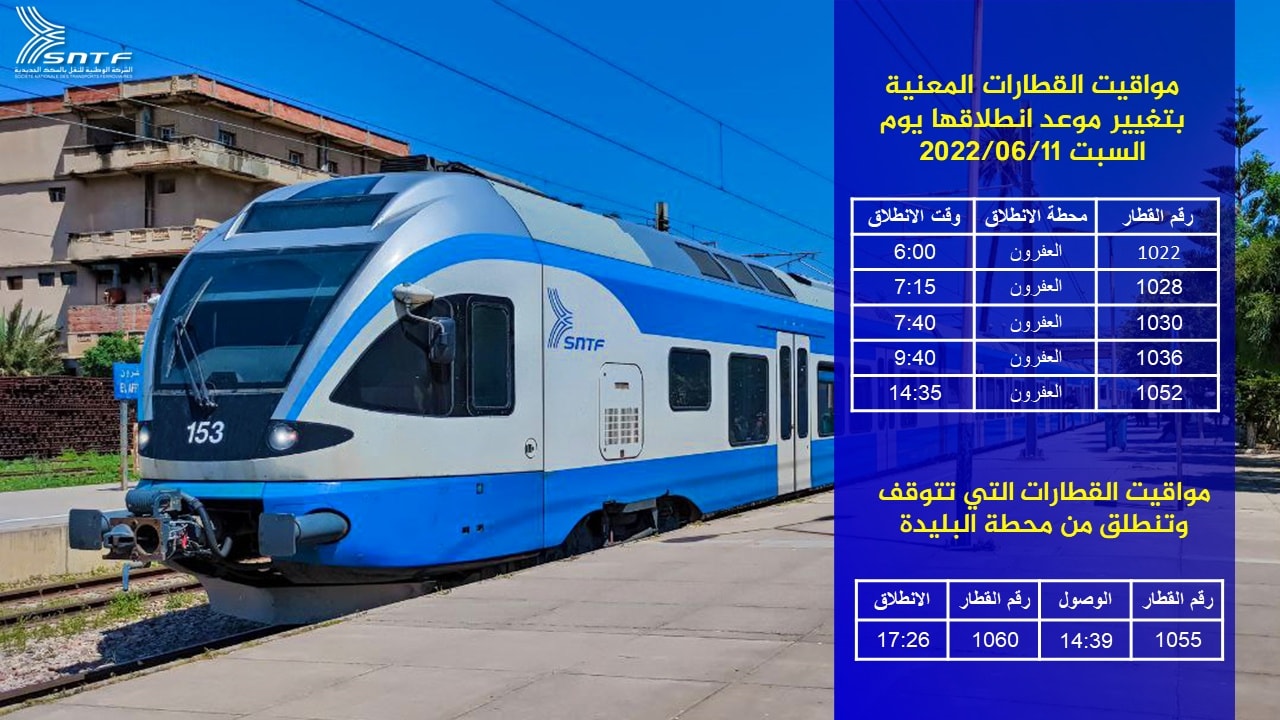 تغيير موعد انطلاق بعض القطارات من محطة العفرون حسب الجدول المبيّن أدناه:كما أن بعض القطارات ستنطلق وتتوقف استثناءً يوم “السبت 11 جوان 2022” في محطة البليدة، وذلك حسب الجدول المرفق أعلاه.