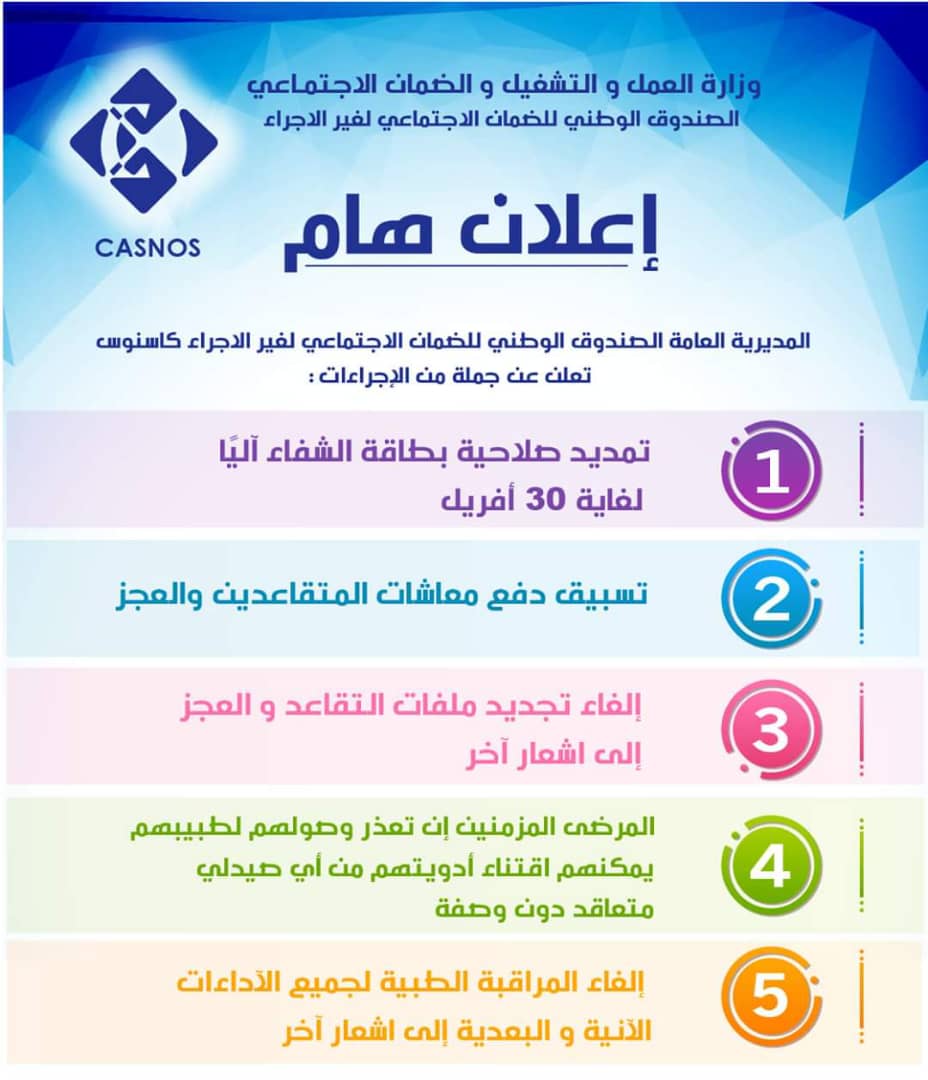 كما أضاف بيان إلغاء تجديد ملفات التقاعد والعجز وكذا المراقبة الطبية لجميع الاداءات الأنية والبعدية إلى إشعار آخر.