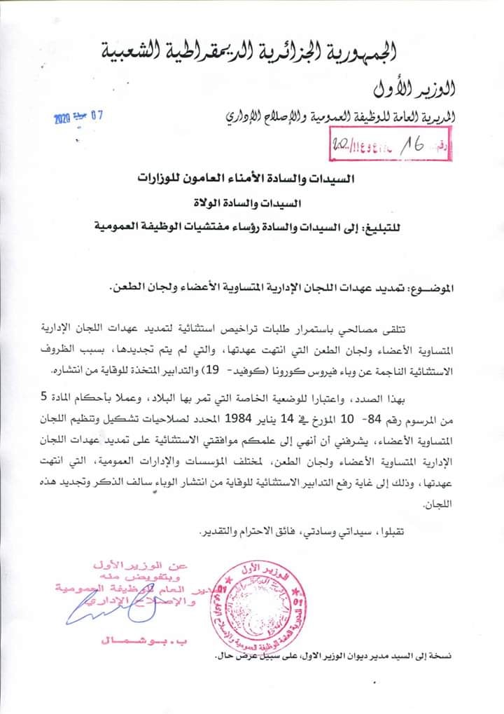 وفي هذا الإطار، تم منح تمديد استثنائي لعمل اللجان الإدارية المتساوية الأعضاء ولجان الطعن المنتهية عهدتها لمختلف المؤسسات والإدارات العمومية.