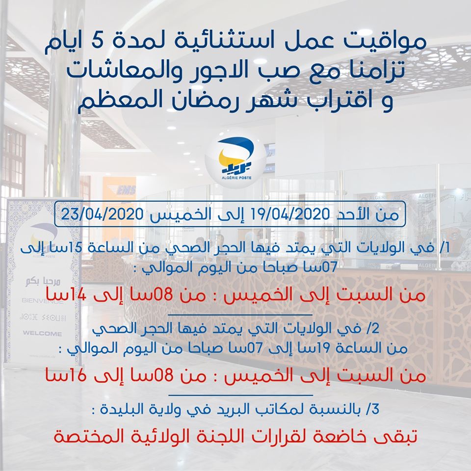 وأشار بريد الجزائر، أنه سيتم تمديد مواقيت العمل بالولايات التي يمتد فيها الحجر الصحي من الساعة 15سا إلى 7سا صباحا من اليوم الموالي.