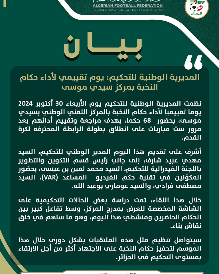 أعلنت الاتحادية الجزائرية لكرة القدم، في بيان لها اليوم الأربعاء، عن تنظيم المديرية الوطنية للتحكيم يوما تقييميا لأداء حكام النخبة. بالمركز التقني بسيدي موسى، بحضور 68 حكما، بهدف مراجعة وتقييم أدائهم.